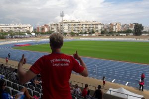 Nach der Rückkehr von Jens Beintken von der Senioren-WM ging nun der Jugendkoordinator der Leichtathletikabteilung des SV Friedrichsfehn in Malaga an den Start. Auch bei Alf war die Vorbereitung aufgrund einer Fußverletzung und der damit verbundenen Trainingspause im Sommer schwierig. Seine erste Disziplin waren die 100 m Hürden. Alf erwischte einen ordentlichen Start und kam gut über die ersten drei Hürden. Dann machte sich das fehlende Training bemerkbar, so dass er an der vierten Hürde mit dem Knie hängen blieb, strauchelte und einen Sturz nur knapp verhindern konnte. Er belegte nach der Auswertung der drei Läufe einen ordentlichen 18. Platz, zufrieden, aber ein wenig unter seinen Möglichkeiten.